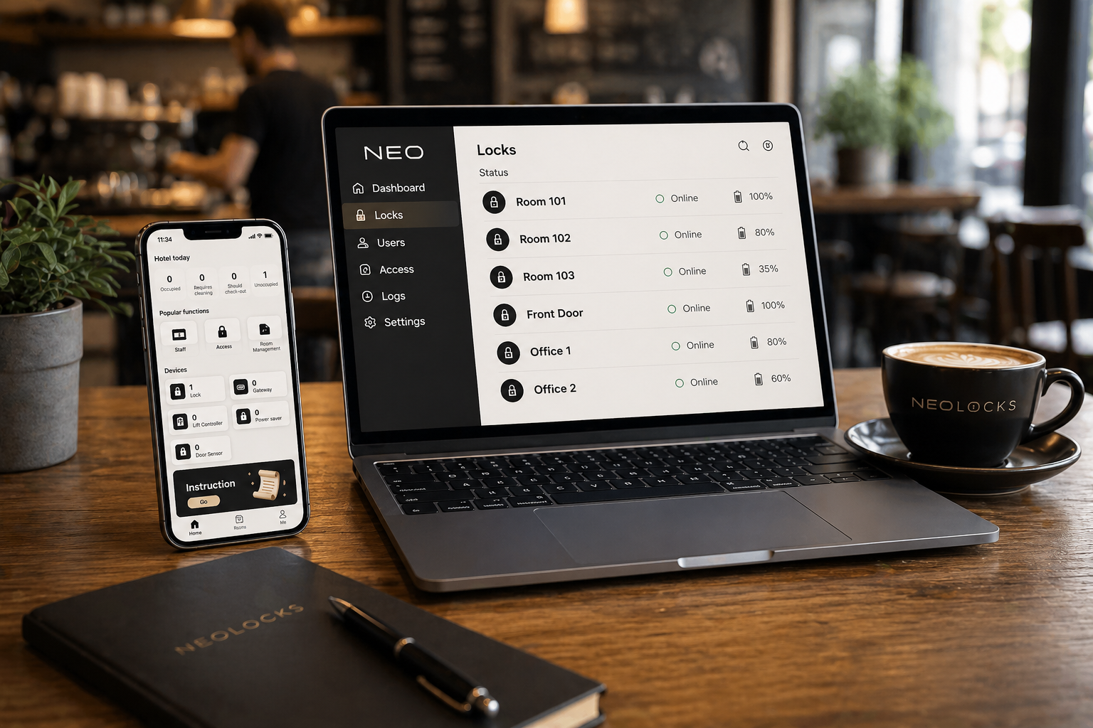 Manage your entire hotel, or multiple properties, from one central platform. NeoLocks gives you full visibility and control over every room, access point, and user, all through an intuitive mobile app and desktop system.